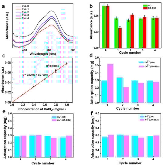 In order to demonstrate the selective adsorption of the GO–BSA membrane towards Co2+, we explored the adsorption capacity of the GO–BSA membranes to other metal ions, including Cu2+ and Fe2+. Figure 6e,f present the adsorption capacities of the GO and GO–BSA membranes to Cu2+ and Fe2+, respectively. This obtained results indicated that the GO–BSA membranes had no significant selective adsorption to Cu2+ and Fe2+. In this process, BSA, as a metal binding protein, played the role of ion transporter. According to previous reports [35], Co2+ easily forms a stable combination with carboxylate and nitrogen, such as aspartate (Asp, D). While Cu2+ leaned toward nitrogen and sulfur ligands, such as histidine (His, H), cysteine (Cys, C), and methionine (Met, M) amino acid ligands. In addition, the similar adsorption amount of Cu2+ and Fe2+ may be related to ligand coordination geometry. The Co2+ ions showed a preference for octahedral while Cu2+ ions were easier to bind square-planar coordination geometry. The certain functional groups on GO–BSA, such as imidazole, can combine with Co2+ but not Cu2+ and Fe2+, leading to selective adsorption of Co2+. After several cycles, the adsorbed metal ions may fall off and enter into the filtrate, which led to the decrease of the adsorption capacity after the first cycle.