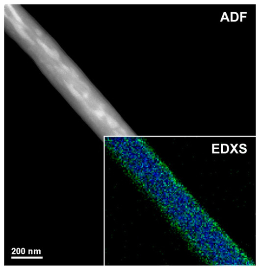 Figure 3 shows a magnified TEM micrograph focusing on a single H2TPP- PsB-MGC fiber. The shape is regular but the heterogeneity of the fiber seems to be confirmed by areas with different contrast among the diverse nanoaggregates. For ADF-STEM imaging, the contrast (brightness/darkness) is approximately proportional to the square of the averaged atomic number projected in beam direction z and it depends linearly on the thickness [41] (in particular, the bigger is the atomic number, the brighter is the image). The bright regions inside the polymer/porphyrin fiber could be due to Br−, counterion to CTA+ (Cetyltrimethylammonium) in the surfactant. The cationic surfactant was used to decrease the aggregation of MGC particles and improve their solubility/stability in the polymer matrix. Thus, the brightest area (a higher scattering, i.e., higher intensity in the image) distributed along the inner part of the fiber is supposed to be consequently and indirectly related also to graphene dispersion. As concerns the distribution of both polymers (PS and PHB), the electrospun nanofibers were expected to result in a bulk matrix mainly composed of one of the two polymers hosting an approximately inhomogeneous dispersion of the second polymer, as a consequence of the poor polymer–polymer miscibility. According to the literature, when two polymers are soluble in the same solvent but incompatible with each other, they solidify in different domains [42] during fiber formation [43]. In the inset of Figure 3, the EDXS chemical map is shown, as obtained from C-K (blue) and O-K peaks (green). Oxygen looks to be more concentrated at the surface of the fiber, leading us to suppose a higher presence of PHB at the surface (carbonyl, hydroxyl and ether groups). On the other hand, the distribution of the porphyrin can hardly be highlighted by this technique since H2TPP is also substantially constituted by C atoms with the exception of the four N atoms in the core of the macrocycle (but having close atomic number); thus, the contrast is too low to recognize the porphyrin. A high affinity between PS and H2TPP (π−π stacking of the aromatic rings) is reported in literature where the homogeneous dispersion of the porphyrin in the surface and inside PS electrospun fibers is described using fluorescence microscopy (homogeneously red colored fibers) [28]. A weak π–π stacking could also occurs between graphene flakes surface and porphyrin molecules [44]. Therefore, porphyrin could be fairly dispersed among PS chains and MGC nanofillers in fiber inner part, and PHB arranged to the outermost part.