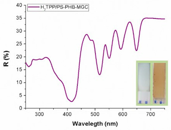The UV-Vis diffuse reflectance (R%) spectrum of a H2TPP-PsB-MGC fibrous layer (Figure 4) showed the characteristic features of the H2TPP chromophore, with the Soret (reflectance minimum about 2.5% at 415 nm) and Q bands well defined (VI: 516 nm, R: 13%; III: 550 nm, R: 19%; II: 591 nm, R: 23%; I: 648, R: 22%). Although the Soret band showed the expected broadening in the solid state, the absence of wavelength shifts seemed to indicate that the porphyrin could be well dispersed in the polymeric matrix. This hypothesis is also supported by the narrow Q bands.