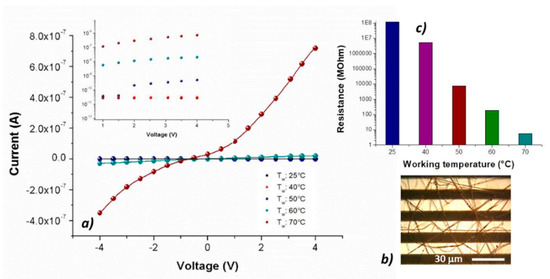 Current vs. voltage diagram at 25, 40, 50, 60 and 70 °C and 25, 40, 50 and 60 °C in the inset (a); optical image of the IDE covered by H2TPP-PsB-MGC fiber (b); and resistance values diagram at 25, 40, 50, 60 and 70 °C (c).