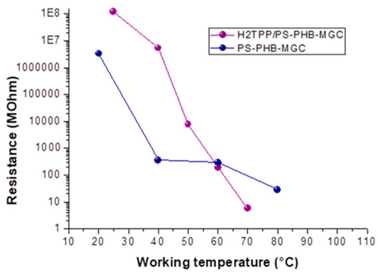 where is the tunnel resistivity, m is the electron rest mass, h is Planck’s constant, V0 is the height of the barrier, and w is its width [51]. Commonly, in a polymer nanocomposite matrix, the gap among nanofillers tends to increase with temperature due to the polymer phase volume expansion (i.e., polymer crystalline phase melting [52]) or the amorphous phase softening [53] during melting, resulting in a resistivity rise of several decades. In the fibrous chemiresistors here described, with and without porphyrin [23], the different results could be explained by the phenyl group rotation in polystyrene (polymer backbone chain reorientation [54]), which could favor strong π–π interactions existing between aromatic organic molecules and the basal plane of MGC. Such a rearrangement could be responsible for the connectivity improvement of the conductive network of the nanofillers, inducing the enhancement of the electrical conductivity [55]. The interfacial force between graphene and PS could be enhanced by surface modification, which reduced the interfacial thermal resistance and dispersed graphene more uniformly [56]. A significant contribution to the MGC rearrangement inside fibers could also be generated by the aromatic planes of H2TPP facing graphene surfaces. Indeed, comparing both the fibrous layers resistance values, H2TPP-PsB-MGC became less resistive than PsB-MGC, when the working temperature reached and went over 60 °C (Figure 6), notwithstanding the disadvantaged parameters listed above of the porphyrin layers to be conductive. More specifically, its resistance value reached ≈5.7 MΩ versus ≈81.6 MΩ of PsB-MGC measured at the same temperature (Tw: 70 °C) in dry and clean air. Furthermore, the steep slope of H2TPP-PsB-MGC curve (Figure 6) could also be affected by the temperature effects on charge transport among porphyrin that is strongly temperature dependent [57]. It means that at lower temperature H2TPP could work as barrier while at higher temperature it should promote conduction.