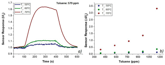 Transient responses (I/I0 versus time) upon injection of 579 ppm of toluene in dry air (a); and response curves (ΔI/I0) to different toluene concentrations at increasing temperature values (50, 60 and 70 °C) (b).