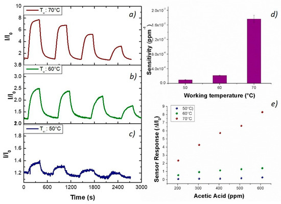 Transient responses (I/I0 versus time) upon injection of different concentration of acetic acid in dry air at: 70 °C (a); 60 °C (b); and 50 °C (c); sensitivity dependence on the working temperature (d); and response curves (ΔI/I0) to increasing acetic acid concentrations and increasing temperature (e).