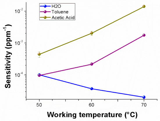 Figure 10 depicts, in semi-logarithm scale, a comparison among the sensitivities to the selected chemicals, enhancing the different affinity of the material to each analyte, the same positive trend for the VOCs and the divergent trend (i.e., sensitivity decreasing) for water vapors. Therefore, going from 50 to 70 °C, the sensitivity to water vapors became five times lower; conversely, to acetic acid and toluene, it was about 32 and 18 times greater, respectively. Another significant sensor feature is the limit of detection (LOD) defined as the lowest concentration of the analyte that can be detected by the sensor under given conditions, particularly at a given temperature. Thus, LODAcAc70 and LODTol70 (three standard deviations of the blank) were lowered up to ~1 and ~3 ppm, respectively.