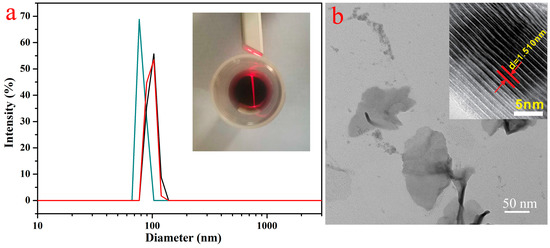 The used MXene-SO3H material was prepared as described in a previous report [20]. The specific experimental method is as follows: 0.05 g MXene powders were immersed in 100 mL deionized water under ultrasonication; 5 g sodium hydroxide was stir-mixed with MXene suspension for 2 h; then the suspension was centrifuged following a big amount of DI water until pH = 7. Subsequently, the obtained Na+ intercalated MXene was chemical modification. The intercalated MXene was immersed in 10 mL DI water and next stir-mixed with above sulfanilic acid diazonium salts for around 6 h under ice-water mixture bath and then centrifuged for 15 min at 8000 rpm. The collected sediment was rinsed with DI water and subsequently centrifuged for 15 min at 5000 rpm to remove unexfoliated particles. The obtained nanoscale surface-modified MXene (abbreviated as MXene-SO3H) dispersion solution was filtered using 0.45 um membrane and finally mild ultrasonication before lyophilized to obtain the powder. Figure 1a demonstrated the measured lateral size of the particles was around 100 nm. The inserted photo represented a colloidal solution of MXene-SO3H particles that exhibited the Tyndall scattering effect when the beam passed through. Figure 1b demonstrated clearly that the representative MXene particles were thin and evenly distributed. The measured high-resolution TEM image of MXene-SO3H showed obvious crystal layer spacing along the c-axis about 1.51 nm. In addition, the zeta potential of MXene-SO3H was determined as −31.2 mV at a neutral pH of 7.0, which seemed similar to previous reported value (−30.6 mV) [20], indicating the good dispersibility of MXene-SO3H particles in water.