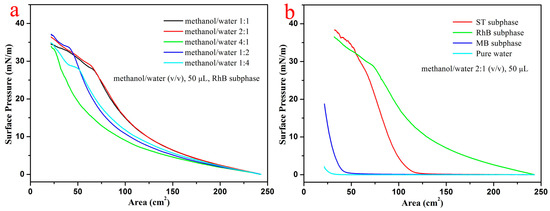 Surface pressure-area isotherms of as-prepared MXene-SO3H Langmuir film spreading on: (a) RhB sub phase, different mixed solvent ratios; (b) different dye sub phases (methanol/water (v/v) of 2:1, volume of 50 μL and concentration of 0.7 mg mL−1).