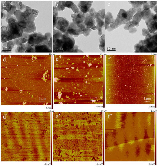 TEM images and tapping mode atomic force microscopy (AFM) images of the transferred films of MXene-SO3H/MB (a,d,d’), MXene-SO3H/RhB (b,e,e’) and MXene-SO3H/ST (c,f,f’) on copper grid or freshly cleaved mica surface, respectively.