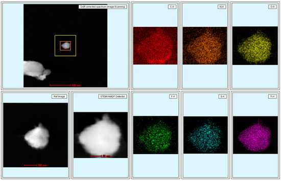 TEM images with elemental mapping scans of C/N/O/F/S/Ti in MXene-SO3H/RhB composite film.