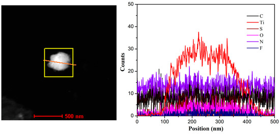 TEM image with elemental line scans of C/N/O/F/S/Ti in MXene-SO3H/RhB composite film.