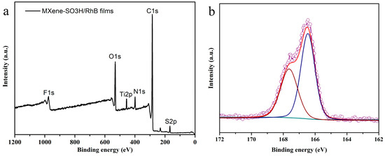 XPS profiles of the obtained MXene-SO3H/RhB composite films (a) and the S2p deconvolutions (b).