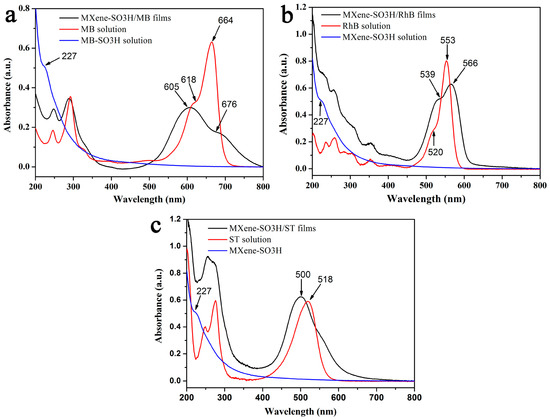 UV-Vis absorption spectra of the transferred multilayer MXene-SO3H/MB films (a), MXene-SO3H/RhB films (b), and MXene-SO3H/ST films (c).