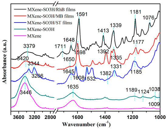 To further characterize the obtained MXene materials and successful preparation of composite films, the FT-IR spectra were also measured and shown in Figure 8, which could be speculated to provide more information about the grafting of sulfonic acid groups and dye molecules successfully adsorbed on surface of MXene-SO3H. Compared with the pristine MXene, surface-modified MXene showed characteristic bands at 1189 and 1009 cm−1, which could be assigned to the p-substituted phenyl groups characteristic vibrations [20,41,42]. The peaks located at 1124 cm−1 and 1038 cm−1 were contributed to S=O bond and S-phenyl band vibrations and compared to S=O bond at 1176 cm−1 from sulfanilic acid, it showed a slightly blue shift, indicating phenylsulfonic groups were successfully grafted on the MXene-SO3H surface. Other bands at 1635 cm−1, 1591 cm−1, 1598 cm−1 and 1608 cm−1 could be assigned to the skeletal vibrations of benzene ring of MXene-SO3H, RhB, MB and ST components. It could be easily observed that compared to MXene and MXene-SO3H materials, benzene ring skeleton stretches of composite films demonstrated a blue shift, suggesting more stronger electrostatic interaction between MXene-SO3H and dye molecules [43]. RhB showed a typical C=O at 1711 cm−1 [44]. In addition, compared to MXene-SO3H, new peaks of imine band C=N at 1648 cm−1, 1650 cm−1 and 1645 cm−1, C–N bond at 1181, 1176, 1190 cm−1 as well as methyl bond at 1339, 1335, 1331 cm−1 appeared on RhB, MB, ST curves, respectively [45,46,47]. And the peaks of C–O, C–H appeared at about 1180 cm−1 and 1390 cm−1, respectively. ST and RhB molecules exhibited stretching vibration band belonging to N–H at 1532 cm−1 and C–O–C at 1076 cm−1 [48]. In addition, the new peaks at 3344 and 3206 cm−1 suggested different strong hydrogen bonding in the MXene-SO3H/ST composite films. These above results indicated that dye molecules existed on the surface of MXene-SO3H.