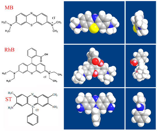 Chemical structures of three used model dyes along with the top and side views of their space-filling models.