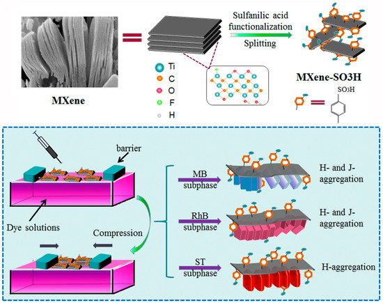 Figure 9 showed the obvious structural differences of three used dye molecules including MB, RhB and ST together with the top and side view of their space-filling models. The common feature of these three dyes was that they all contained large heterocyclic conjugated systems. The dimensions of the organic dyes are defined as x × y × z, wherein x, y and z represent the three edges of a cuboid that can just include the molecule. MB is one kind of planar molecules with x value of 16.3 Å, y value of 7.9 Å and z value of 4.0 Å. RhB is cationic with a triangle structure and contains a carboxylic group, wherein the values of x, y, z are 17.9 Å, 9.8 Å and 4.3 Å, respectively. In addition, ST demonstrates a T-type structure with x value of 16.1 Å, y value of 9.6 Å and z value of 4.3 Å [49,50,51,52,53,54,55]. Combined with the above results, schematic illustration of the preparation process of MXene-SO3H and the self-assembled modes in MXene-SO3H/dye composite Langmuir films were shown in Figure 10. At first, the targeted amphiphilic MXene-SO3H were prepared by intercalation of Na+ ions and the modification of sulfanilic acid diazonium salts. Then the MXene-SO3H/dye composites Langmuir films and interfacial self-assembled behaviors at the air-water interface have been characterized and investigated via π-A isotherms, AFM and FT-IR techniques. Depending on different molecular structures in three used model dyes, H-and/or J-aggregates could be formed in different MXene-SO3H composite LB films, demonstrating reasonable and precise regulation of composite films via design of suitable components in organized nanostructures [56,57,58,59,60,61,62,63,64].