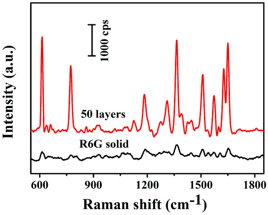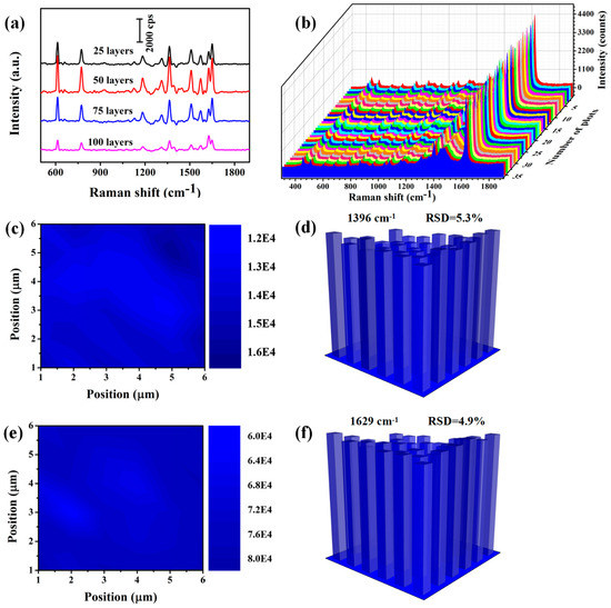 For the SERS measurement, all of the Raman spectra were measured by the Renishaw inVia Raman microscope with the 532 nm laser as excitation source. For the laser, the diameter of the light spot was ~1 µm and the incident power was 0.05 mW. In order to compare the SERS performance, four different layer substrates have been prepared to select the best substrate by R6G solution (10−3 M, 10 μL). The SERS performance such as uniformity and reproducibility was measured by the best substrate. In addition, the spectra were recorded by the 2 accumulations, the 10 s exposure time and the ×50 objective.