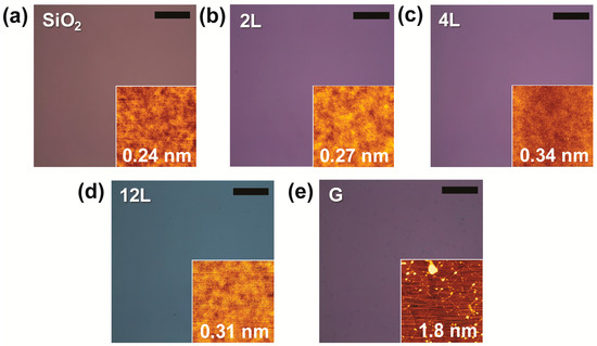 Optical and AFM images (insets, 4 µm × 4 µm scan) of (a) a bare SiO2/Si sample, and (b) 2L MoS2, (c) 4L MoS2, (d) 12L MoS2, and (e) 1L graphene each on a SiO2/Si substrate. Texts in the insets indicate RMS surface roughness. Scale bars, 20 µm.