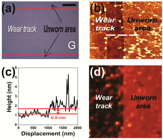 Of these layered materials, graphite is the most widely used solid lubricant because of its superb lubricity, low cost, and abundance in nature [4]. As large-area synthesis and transfer of single-layer graphene have become feasible, graphene has been emerging as a promising candidate for serving as an atomically thin solid lubricant [5,6,7]. Atomically thin solid lubricants can be effectively utilized for demanding applications such as microelectromechanical and nanoelectromechanical systems (MEMS and NEMS), and bio-implants, where sliding occurs over small distances, specifically in the sub-micrometer range. Graphene, in particular, has been reported to show excellent tribological performance in micro-scale dry contact [8].