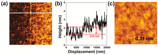 Slips can occur at the interlayer of a layered material when a friction force is released parallel to the interlayer plane [1]. If wear occurs in a layer-by-layer fashion, the underlying layer would be exposed to the sliding surface after detachment of the top layer. The newly exposed layer should have a surface morphology essentially identical to that of the original top layer if there is no plastic deformation during sliding, and the wear depth should correspond to integer multiples of the monolayer thickness. To test this hypothesized layer-by-layer wear mechanism, we obtained an AFM image of the boundary between the worn and unworn areas of the 12 L MoS2 sample subjected to 5 cycles of sliding, as shown in Figure 5a. The difference between the height of the worn area and that of the unworn area was measured to be about 0.8 nm (Figure 5b), corresponding to the thickness of a monolayer of MoS2. Also, the worn area here showed an RMS roughness of 0.31 nm (Figure 5c), close to the RMS roughness values measured for the unworn MoS2 films shown in Figure 1b–d. Based on these height difference and RMS roughness results, we concluded that the wear of the tested MoS2 film occurred in a layer-by-layer fashion.