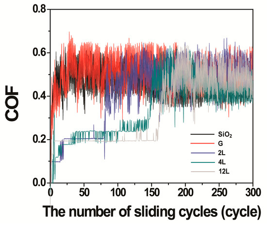 Compared to the graphene sample, the tested MoS2 samples exhibited lower coefficient of friction values. After 10 cycles of sliding, these values were only 0.1 to 0.2 for the MoS2 samples, as shown in Figure 2a. Moreover, the coefficient of friction of the 12L MoS2 film remained at a low value of 0.2 even up to 200 cycles of sliding, as shown in Figure 3b. These results verified the superior frictional properties and wear resistance of the MoS2 films compared to those of the graphene film.