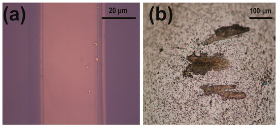As shown in Figure 6, MoS2-coated SiO2/Si samples showed relatively low and stable coefficients of friction, in the range 0.18 to 0.24, for the first few dozens of sliding cycles, with the thickest tested MoS2 film showing this relatively low friction coefficient for the most cycles. But after several additional cycles, the coefficients of friction did increase, to 0.48 ± 0.05, comparable to the friction coefficient of bare SiO2/Si. The eventual similarity of the friction levels of the MoS2-coated SiO2/Si to that of bare SiO2/Si was thought to be caused by the removal of the MoS2 film from its substrate. To test this explanation, optical images of the MoS2-coated SiO2/Si samples were taken after 50 sliding cycles, at which point the coefficient of friction was still low and stable. The optical image of the sample coated with the 2L MoS2 film (Figure 7a) showed that the MoS2 film was totally removed from its substrate after 50 cycles of sliding, despite the sample having still exhibited the relatively low level of friction, i.e., lower than that of the bare SiO2/Si. After the sliding test, the film appeared to have transferred onto the counter-surface of the SiC ball, according to the image of the ball shown in Figure 7b. These results taken together suggested that the transferred MoS2 functioned as a solid lubricant on the ball to retain the lower friction level for a few additional cycles of sliding [4,8].