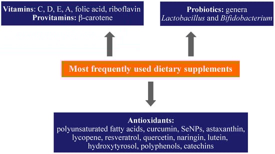 Basic types of preparations/materials influencing human health or condition can be classified as follows: (i) drug products, (ii) homeopathics, (iii) dietary supplements (DISs), (iv) medical devices, (v) cosmetics, and (vi) biocidal products. Dietary (food) supplements are products that look similar to medicines (can be sold in pharmacies) but are a special category of foods. They contain vitamins, minerals, amino acids, essential fatty acids, natural products, probiotics, etc., as active ingredients. The purpose of a DIS is to keep the human body functioning properly by delivering compounds that are needed by the human body but could not be received sufficiently from a regular diet. According to the manufacturers, DISs have beneficial effects on health conditions. They are manufactured in the form of pills, capsules, tablets, or liquids [3,4]. DISs are regulated by many guidelines, regulations and directives, for example, by the European Commission directives 2002/46/EC and 2006/37/EC, European regulations 1924/2006, 1137/2008, 1170/2009, 1161/2011, 119/2014, 2015/414, 2017/1203 [4], and by a number of documents published by the U.S. Food and Drug Administration (FDA) [5], to ensure the quality and safety of these products, to protect consumers against potential health risks from such products, and to ensure that they are not provided with misleading information. In addition, DISs are regulated by the European Food Safety Authority (EFSA), national legislation (e.g., on food) and regulations (e.g., requirements for food supplements and food enrichment), etc. For example, in the EU market, approx. 30 approved nutrition claims (meaning that specific requirements are to be met) can be found, and a product can be marketed as a DIS only if it meets the so-called health claims, which is any statement about a relationship between food and health. The European Commission approves various health claims, which have to be easily understood by consumers, based on scientific evidence. The EFSA is responsible for evaluating the scientific evidence supporting health claims, the types of which are as follows: (i) ‘Function Health Claims’ (relating to the growth, development and functions of the body, or referring to psychological and behavioral functions, or on slimming or weight-control), (ii) ‘Risk Reduction Claims’ (on reducing a risk factor in the development of a disease), and (iii) Health ‘Claims referring to children’s development’ [6].