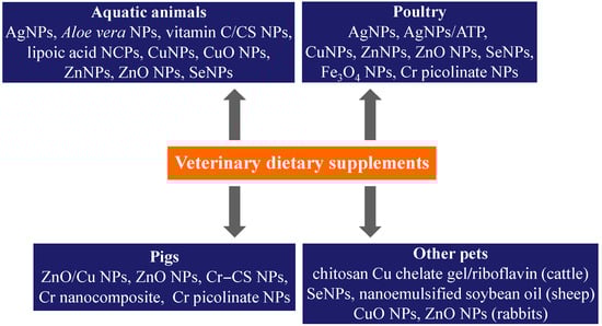 The above-mentioned nanoformulations can be found in many drug classes, and so it is not surprising that supplements and FSMPs have also started being formulated in the nanoscale, especially with the aim to improve bioavailability, protect active ingredients against degradation, or reduce side effects. Therefore, this contribution summarizes the current state of the research focused on nanoformulated human and veterinary DISs and FSMPs.