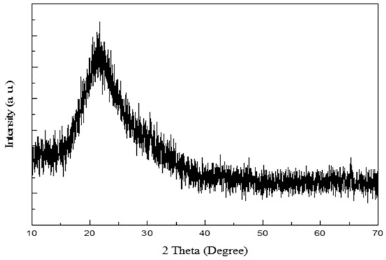The XRD pattern of RHA was confirmed as a broad peak from 16° to 40° with a centered peak at 21.6°, as shown in Figure 2; this is the typical graph of amorphous silica [18].