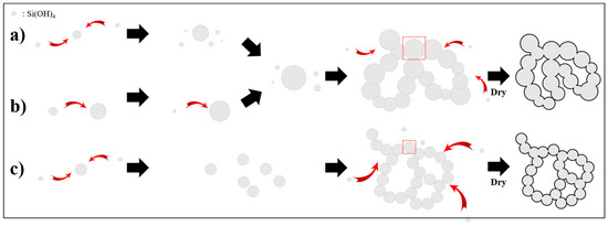 Monosilicic acid surrounding the acidic droplet in a sodium silicate solution is hydrolyzed into a monomer when HCl is fed to the sodium silicate solution. The initial monomer that is aggregated restructures as large particles for stability by consuming primary smaller particles by dissolution and reprecipitation, which is termed as the Ostwald ripening mechanism [24,25]. The clusters prepared under high-acidity conditions and a slow feed rate were restructured as a colloidal consisting of a large particle as there was sufficient time to grow (Figure 5a). The pore inside of the colloidal gel was shrunk by a drying process, causing a low specific surface area. In contrast, at a fast feed rate, the initial particle consumed the smaller primary one and formed a colloidal gel with big particles and a low specific surface area, as shown in Figure 5b. However, a feed rate of 2.5 mL/min was the rate at which each cluster grew to form a particle of the same size as that resulting from the solubility equilibrium. This was due to necks developing between particles from dissolution and reprecipitation. The gel shrunk less when it dried, with enhanced stiffness and high specific surface area, as shown in Figure 5c. The morphology of each sample depending on the acidic feed rate was confirmed by FE-SEM analysis, as shown in Figure S5. The silica aerogel prepared at the slow or fast rate of acidic feeding showed shrinkage between the pore space after the drying step and had polysized particles, while the sample at optimized rate had monosized particles and large pore space.