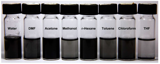 Digital photo of GO-PFcMAss in different organic solvents and water.
