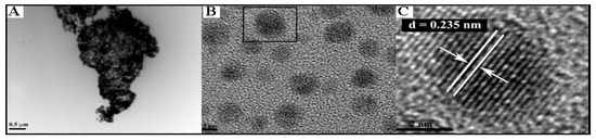 (A) TEM, (B) and (C) HRTEM images of GO-PFcMAss-AuNPs nanocomposite.