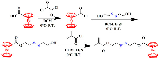Dichloromethane (DCM) was dried over CaH2 and distilled over CaH2 under N2 prior to use. Triethylamine (Et3N, Aldrich, 99.5%) was dried over KOH and distilled over CaH2 under N2 prior to use. As shown in Scheme 2, ferrocenoyl chloride obtained by reacting ferrocenecarboxylic acid (Alfa Aesar (Shanghai, China), 98%) with oxalyl chloride (J&K, Beijing, China, 98%) was treated with bis(2-hydroxyethyl) disulfide (Alfa Aesar, 90%) to afford the monoesterification product, which reacted with methacryloyl chloride (Aldrich, St. Louis, MO, USA, 90%) in the presence of Et3N to produce the target monomer, FcMAss (total yield: 53.4%). FI-IR (film): ν (cm−1): 2960, 2858, 1716, 1637, 1460, 1380, 1273, 1218, 1132, 1068, 941, 912, 818, 773. 1H-NMR (400 MHz, CDCl3): δ (ppm): 1.95 (3H, CH3C), 3.02 (4H, CO2CH2CH2S–SCH2CH2O2C), 4.21, 4.40, 4.81 (9H, ferrocenyl), 4.45 (4H, CO2CH2CH2S-SCH2CH2O2C), 5.58, 6.14 (2H, CH2=C).
