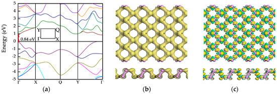 For testing the validity of parameters, we first optimized the structure of pristine black phosphorene, and the structure parameters obtained were a = 4.48 Å and b = 3.34 Å, which are well consistent with previous studies and experiments [4,10,21,27]. Subsequently, we also calculated the electronic properties of pristine black phosphorene. The results are exhibited in Figure 2. It is obvious in Figure 2a that the direct band gap is 0.84 eV, which agrees with the results of previous researches [10,19,21]. In addition, Figure 2b,c illustrate the strong covalent bonding between the P atoms in black phosphorene. Especially in Figure 2c, electrons shift from the periphery of P atom to the bond direction, so that electron accumulation emerges in the middle of bonds suggesting the strong covalent interaction between P atoms.