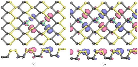 In first-principles studies, the energy band structure and various density profiles are always used to describe the electronic properties of materials. In our work, the electron density (ED) shown in Figure 8 and the charge density difference (CDD) shown in Figure 9 are also employed to further depict the electronic properties of doped phosphorenes. Compared with the ED of pristine phosphorene, it can be found that the bonds between impurity atoms and neighboring P atoms are not covalent. In addition, there is little electron around Al atoms, whereas the electrons round Cl atoms are more than that around P atoms. To observe the charges around impurity atoms carefully, CDD is obtained by: