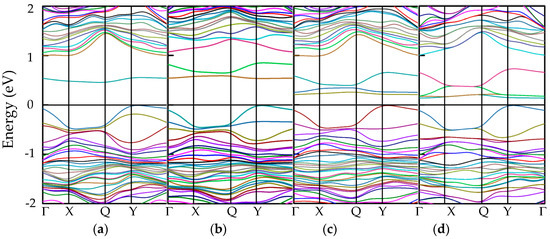 The band structures of doped phosphorenes with different impurity atoms: (a) P63Al1, (b) P62Al2, (c) P61Al3, (d) P60Al4, (e) P63Al1, (f) P62Cl2, (g) P61Cl3, and (h) P60Cl4. The Fermi level is shifted to zero.