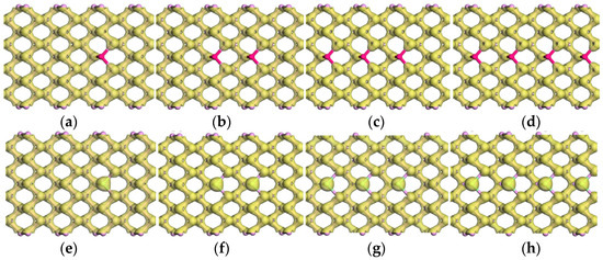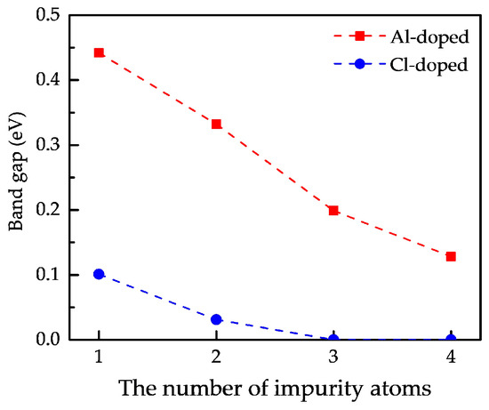 It is obvious that the band gap of Al-doped phosphorene shows a nearly linear decline from 0.45 eV to 0.14 eV with the number of impurity atoms increasing, while that of Cl-doped phosphorene first drops from 0.11 eV to 0 and then becomes flat. The reduction of band gap is induced by the increase in the number of impurity atoms and the number of impurity levels. As the number of impurity atoms increases, the overlapping of electron density occurs around the impurity atoms, which accounts for the splitting of impurity levels and the formation of impurity bands. The formation of impurity bands lessens the band gap of doped phosphorene significantly. As the number of impurity atoms further increases, degeneracy takes place in the impurity bands, such as Figure 6d,g,h. Due to the emergence of degeneracy, the impurity bands affect the band gap of doped phosphorene slightly, so that the curves about band gap versus the number of impurity atoms become flat.
