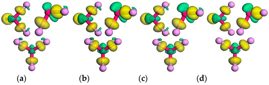 Due to the similarity of charge transfer between impurity atoms and neighboring P atoms, the CDD around one impurity atom (‘1’ site shown in Figure 1) and its neighboring P atoms is exhibited in Figure 9. From this, one can find that in the Al-doped phosphorene electrons are transferred from Al atom to neighboring three P atoms indicating Al atom is donor, which agrees with the impurity levels below conduction bands but above the Fermi level presented in Figure 6a–d. Unlike the Al-doped phosphorene, electrons from two in-plane P atoms accumulate around the impurity atom in the Cl-doped phosphorene, which suggests Cl atom is acceptor. This difference of the external charges on impurity atoms in the Al- and Cl-doped phosphorenes is caused by the different electronegativity of Al and Cl atoms. As known, the electronegativity of Al atom is 1.5 which is smaller than that of phosphorus atom 2.1, while the electronegativity of Cl atom is 3.0. This electron transfer reveals that the bonds between impurity atoms and neighboring P atoms own an ionic character. In addition, it can also be found that the density of external charge around Cl atom increases significantly as the number of impurity atoms increases from 1 to 3, whereas there is no obvious variety around Al atom.