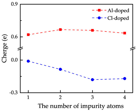 To explore the variety of the external charge on impurity atoms with the increase in the number of impurity atoms, the average external charge of multi-impurity atoms obtained by Mulliken analysis [28,29] is exhibited in Figure 10. Positive value indicates donating electrons to P atoms, while negative value means accepting electrons from P atoms. From Figure 10, we can find that the external charge on Al atom ranges from 0.62 e to 0.67 e and varies slightly, while that on Cl atom changes significantly from −0.01 e to −0.18 e. In details, when the number of impurity atoms is three the external charge on Cl atom is the most and up to −0.18 e and when the number of impurity atoms is two the external charge on Al atom is the most and up to 0.67 e, which suggests bonds between impurity atoms and neighboring P atoms in the doped phosphorene with the largest formation energy possess the most obvious ionic character. These values of external charge are consistent with the results obtained from CDD in Figure 9. According to these density profiles and the Mulliken analysis of external charge, we draw a conclusion that a proper increase in the number of impurity atoms can strengthen the electron transfer between impurity atoms and neighboring P atoms, but once the number of impurity atoms further increases, the electron transfer would be weakened because of the emergence and enhancement of overlapping between the electron density of impurity atoms.