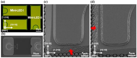 The GaN-based LEDs were grown on c-plane PSS using metal–organic chemical vapor deposition (MOCVD) method. The LED epitaxial structure consisted of a 25-nm-thick low temperature GaN nucleation layer, a 3.0-μm-thick undoped GaN buffer layer, a 2.5-μm-thick Si-doped n-GaN layer, a 12-pair of InGaN (3 nm)/GaN (12 nm) multiple quantum well (MQW), a 40-nm-thick p-AlGaN electron blocking layer, and a 112-nm-thick Mg-doped p-GaN layer. The LED wafer was subsequently annealed at 750 °C at N2 atmosphere to activate Mg acceptor in the p-GaN. Then, the photolithography and inductively coupled plasma etching (ICP) process based on BCl3/Cl2 mixture gas were performed to form the mesa structure and deep isolation trench. Afterwards, the TMAH-based crystallographic etching procedure was applied. The LED wafers were dipped into the 15 wt% TMAH solution at 85 °C during the TMAH etching process. After rinsing with deionized water and drying under N2 flow, a 60-nm-thick indium tin oxide (ITO) transparent conductive layer was evaporated on the p-GaN layer. Cr/Al/Ti/Pt/Au metallization schemed as ohmic contact layer was deposited on the ITO and n-GaN layer. Sixteen pairs of quarter-wavelength-thick TiO2/SiO2 stacks, as distributed Bragg reflectors, were sputtered by ion beam deposition followed by the opening of via through DBR using ICP etching based on CHF3/Ar/O2 mixture gas. Cr/Ti/Pt/Au metallization was evaporated as contact pads subsequently. Finally, the LED wafer was thinned down to about 150 μm and diced into chips with dimensions of 101 μm × 200 μm. The peak emission wavelength of the fabricated mini-LEDs was 456 nm. The light output power–current–voltage (L-I-V) characteristics of mini-LEDs were measured using a semiconductor parameter analyzer (Keysight B2901A, Santa Rosa, CA, USA) with an integrating sphere. In this work, two types of mini-LED chips with different sidewall orientations on the same LED wafer (as shown in Figure 1) were investigated by the scanning electron microscope (SEM) owing to the anisotropic etching behavior of TMAH-based crystallographic etching. The two types of mini-LEDs were named as mini-LED I and mini-LED II according to the sidewall orientation. The larger sidewalls of mini-LED I were set to be orientated along [10-10] direction, while the larger sidewalls of mini-LED II were set to be orientated along [1-210] direction.