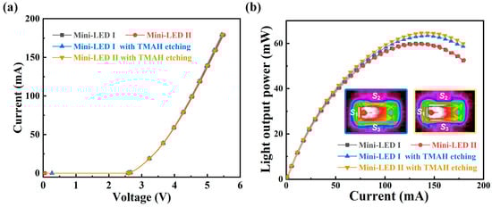 To verify the TMAH etching is a damage-free process, the I-V characteristics of mini-LEDs with and without TMAH etching treatment were investigated, as shown in Figure 3a. A 7.5 min TMAH etching procedure only caused slight variation in forward voltages of mini-LEDs, suggesting no electrical degradation was brought in by the TMAH etching process. Previous reports on improving the sidewall surface area by ICP etching generally incorporate plasma damage, which leads to deteriorated electrical property [31,32]. The TMAH etching demonstrated here provided an alternative solution without reducing the top emitting area and deteriorating the electrical property.