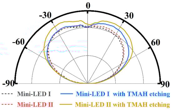 Far-field radiation patterns of the flip-chip mini-LEDs without TMAH etching treatment and with 7.5 min TMAH etching treatment.