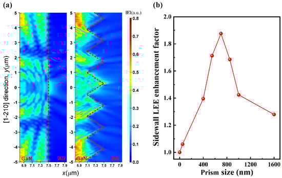 To reveal the fundamental principle of prism structure on light extraction, the finite-difference time-domain (FDTD) simulation was conducted. The simulation model was built based on the above-described device structure and scaled to the size of 15 μm × 30 μm considering the computational capacity. Perfectly matched layers (PML) was adopted as boundaries to avoid unnecessary reflected light. The grid size in the simulation domain was 10 nm for accuracy with the limitation of computer memory. Transverse electric (TE) and transverse magnetic (TM) polarized point sources with a ratio of 1.8:1 were positioned in the center region of MQW [33] and the emission wavelength was set to be 456 nm. Figure 5a shows the simulated electric field intensity distribution nearby the smooth and prism-structured sidewalls of epilayer. The electric field emitting out from the smooth sidewall is mainly confined at the center region, while an intensified electric field emitted out from the prism-structured sidewall with a broader distribution in air. The broader and stronger electric field emitting out from the prism-structured sidewall suggested that the prism-structured sidewall acted more effectively in extracting light out than the smooth sidewall. The relationship between sidewall light extraction efficiency and prism size is presented in Figure 5b. The strong dependence of sidewall light extraction efficiency on the prism size indicating that the enhancement mainly arose from more light scattering out from the epilayer mode rather than only randomizing of light rays [34].