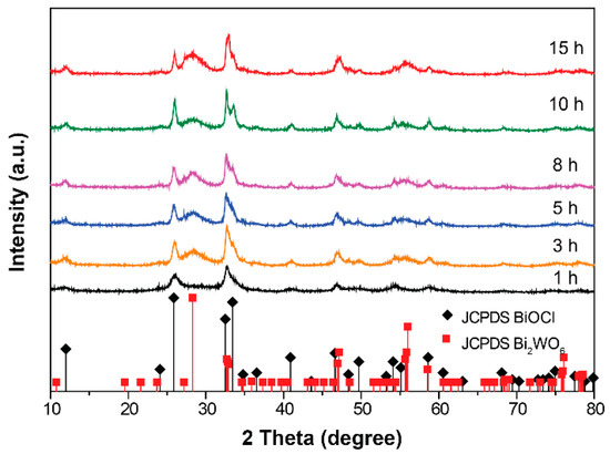 Furthermore, the time-dependent phase structure evolution of the hybrid catalysts was investigated, as shown in Figure 2. During the early hydrothermal stage (t = 1 h), only the diffraction patterns of the BiOCl phase could be observed, which may be due to the low formation energy of BiOCl compared to Bi2WO6 [18]. However, from 3 h on, we found the appearance and gradual enhancement of the diffraction intensity assigned to the Bi2WO6 phase. Based on this evidence, it can be concluded that during the growth process of hybrids, BiOCl first forms and then serves as the nucleation site, benefitting the nucleation and growth of Bi2WO6. A schematic flow chart for the synthesis of BiOCl/Bi2WO6 hybrid materials is shown in Figure S3.