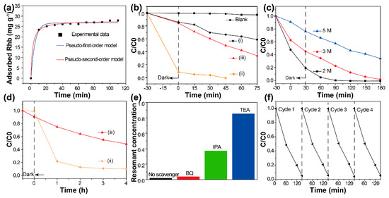 It has been revealed that photocatalytic reactions always occur at the surface of catalysts [19,20]. The target should be attached to the surface of photocatalysts. To investigate the adsorption behaviors of the developed hybrid materials, dark adsorption experiments were carried out (details in the supporting information). Figure 4a shows the change in adsorbed RhB as a function of contact time. Clearly, the initial adsorption of RhB is very rapid. After 30 min of contact with BiOCl/Bi2WO6 hybrids, equilibrium adsorption capacity was almost achieved. The adsorption kinetics of RhB molecules was calculated using the Lagergren-first-order and pseudo-second-order models, and the results indicate that the adsorption process was chemisorption [21,22]. The related parameters are summarized in Table S1.