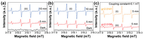 We used the electron spin resonance technology to qualify the formation difference of ·OH species under visible light [27,28]. The results are shown in Figure 5. It was found that the strong ESR spectra with relative intensities of 1:2:2:1 corresponding to DMPO-·OH adduct were clearly observed for the Bi2WO6 (Figure 5a) and BiOCl/Bi2WO6 hybrids (Figure 5b). Under the dark condition, no DMPO-·OH signals were detected for the Bi2WO6 and BiOCl/Bi2WO6 hybrid materials. This result suggested that the precondition for formation of the ·OH species is the presence of visible light. In addition, as shown in Figure 5c, the DMPO-·OH signal intensity from the BiOCl/Bi2WO6 hybrid materials was much higher with respect to Bi2WO6. Thus, the presence of BiOCl was beneficial for the more effective separating ability of photogenerated carriers because of the favorable heterojunction effect.