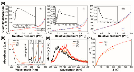 (a) Brunner−Emmet−Teller (BET) surface area analysis, (b) UV-vis diffuse reflectance spectra and (c) Photoluminescence (PL) of the as-prepared samples: (i) BiOCl, (ii) BiOCl/Bi2WO6 and (iii) Bi2WO6. Insets (a) and (b) are the corresponding pore size distribution and band gap energies of the prepared samples, respectively. (d) The electrochemical impedance spectra (EIS) spectra of (ii) BiOCl/Bi2WO6 and (iii) Bi2WO6.