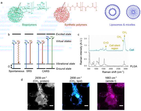 Raman imaging of nanocarriers. (a) Representation of different materials which can be fabricated into nanocarriers, such as biopolymers (e.g., alginate), synthetic polymers (e.g., PLGA), and lipids (as liposomes and micelles). (b) Energy level diagrams showing the processes of spontaneous Raman, stimulated Raman scattering (SRS), and coherent anti-Stokes Raman scattering (CARS). (c) Spontaneous Raman spectra showing the characteristic peaks in microglia (top, green spectrum) and PLGA, a common polymer for drug delivery (bottom, black spectrum). Spectra are normalized and offset for clarity. (d) SRS images of microglia when Ω = 2939 cm−1 (CH3, proteins, grey), 2856 cm−1 (CH2, lipids, cyan), and 1663 cm−1 (amide I, magenta). Scale bars = 5 µm.