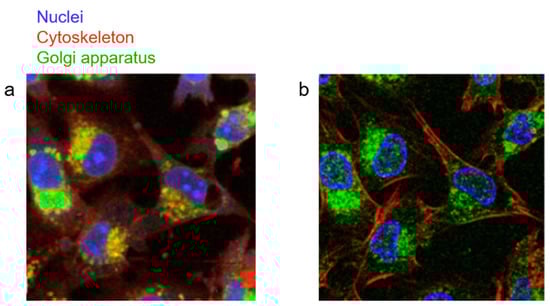 Since fluorescence imaging is the gold-standard in many laboratories, Klein et al. used both immunofluorescence (IF) staining and confocal Raman imaging to probe the nucleus, cytoskeleton, and Golgi apparatus of the same cells [63]. Raman is non-destructive, so these images were acquired before staining the cells with fluorescent markers. PCA was used to identify the main components of the Raman image, which were assigned to organelles according to their similarity to their IF counterparts to predict Raman-based, artificial IF cells. A key advantage of Raman is that more than three organelles can be identified from the label-free Raman signal, and it is not limited by overlapping Stokes’ shifts of fluorophores, as in IF. Figure 2 shows that there is good overlap between the Raman-based artificial IF (a) and IF (b) images, and that similar features are observed in both.