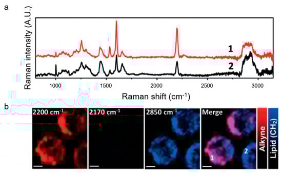Recently, alkyne tags have also been used to label nanocarriers in order to study their intracellular behavior. In 2017, Li et al. reported Raman imaging of nanocarriers synthesized from poly(phenylene ethynylene) (PPE), a water soluble polymer which contains an intrinsic alkyne [80]. A nanoprecipitation method was used to form nanoparticles from the polymer, and the particles were also conjugated to TAT peptide, a peptide sequence known to be cell penetrant [81]. When incubated with HeLa cells, the nanoparticles were observed by Raman imaging to localize in the cytoplasm (Figure 3). The spontaneous Raman spectra in Figure 3a show a strong, sharp alkyne peak at 2200 cm−1, along with the characteristic cellular peaks. Figure 3b shows that the alkyne signal co-localizes with the cellular lipids (2850 cm−1) and that there is an absence of signal in the cell-silent region at 2170 cm−1, confirming that the signal in the on-resonance image is due to TAT-PPE nanoparticles.