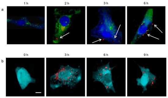 The uptake of polymeric nanocarriers. (a) The uptake of epidermal growth factor receptor targeted nanoparticles to SKOV-3 cells over time shows that particles enter after 2 h. Images are overlays of the cell body and nucleus (blue), membranous organelles (green), early endocytic vesicles (yellow), and nanoparticles (red). White arrows show regions of nanoparticle aggregation. Reproduced with permission from [82], published by Springer Nature (2013). (b) The uptake of β-carotene loaded poly lactic-co-glycolic acid (PLGA) nanoparticles into murine NIH-3T3 cells showing the cell body (cyan) and nanoparticles (red). Scale bar = 10 µm. Reproduced with permission from [83], Copyright John Wiley and Sons, 2013.