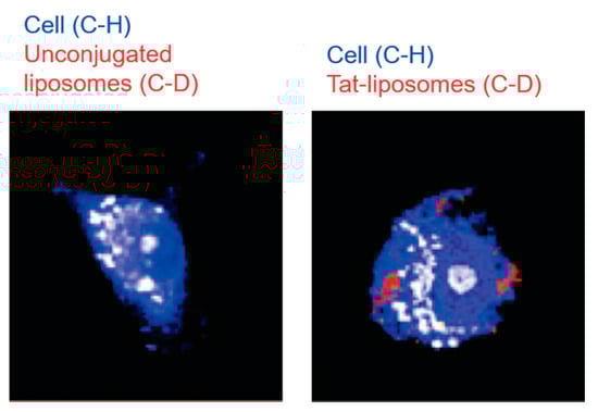 Uptake of deuterated liposomes to MCF-7 cells after 6 h of incubation. C–H stretching shown in blue and C–D stretching shown in red. There are no unlabeled liposomes inside the cell after 6 h but the TAT-liposomes are visible in the cytoplasm. Reproduced with permission from [85], Copyright American Chemical Society, 2008.